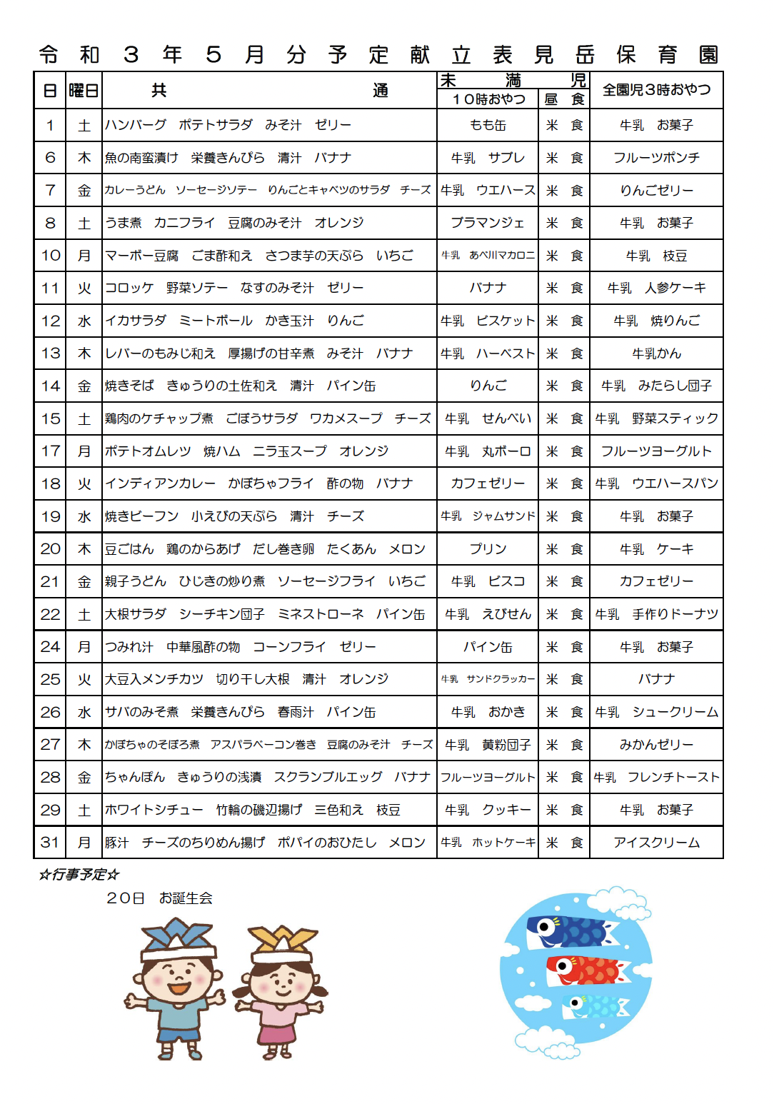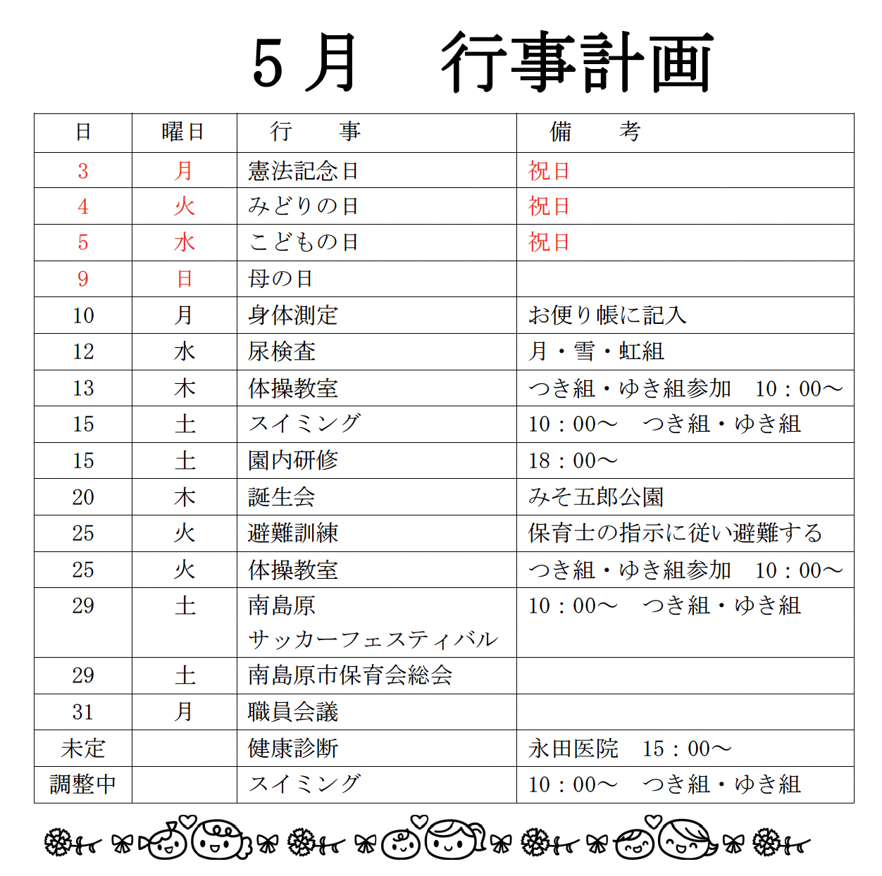 新緑が鮮やかで、とても心地よい季節になりました。子ども達は入園・進級してから1ヶ月が過ぎ、園の生活にも慣れてきたようです。お兄さん、お姉さんになったお友達は、小さいお友達の面倒を見たりブランコ、すべり台、砂場とそれぞれ好きな遊びを見つけて遊んでいます。爽やかな季節、水分をこまめに取りながら、戸外で元気いっぱい遊べるようにしていきたいです。