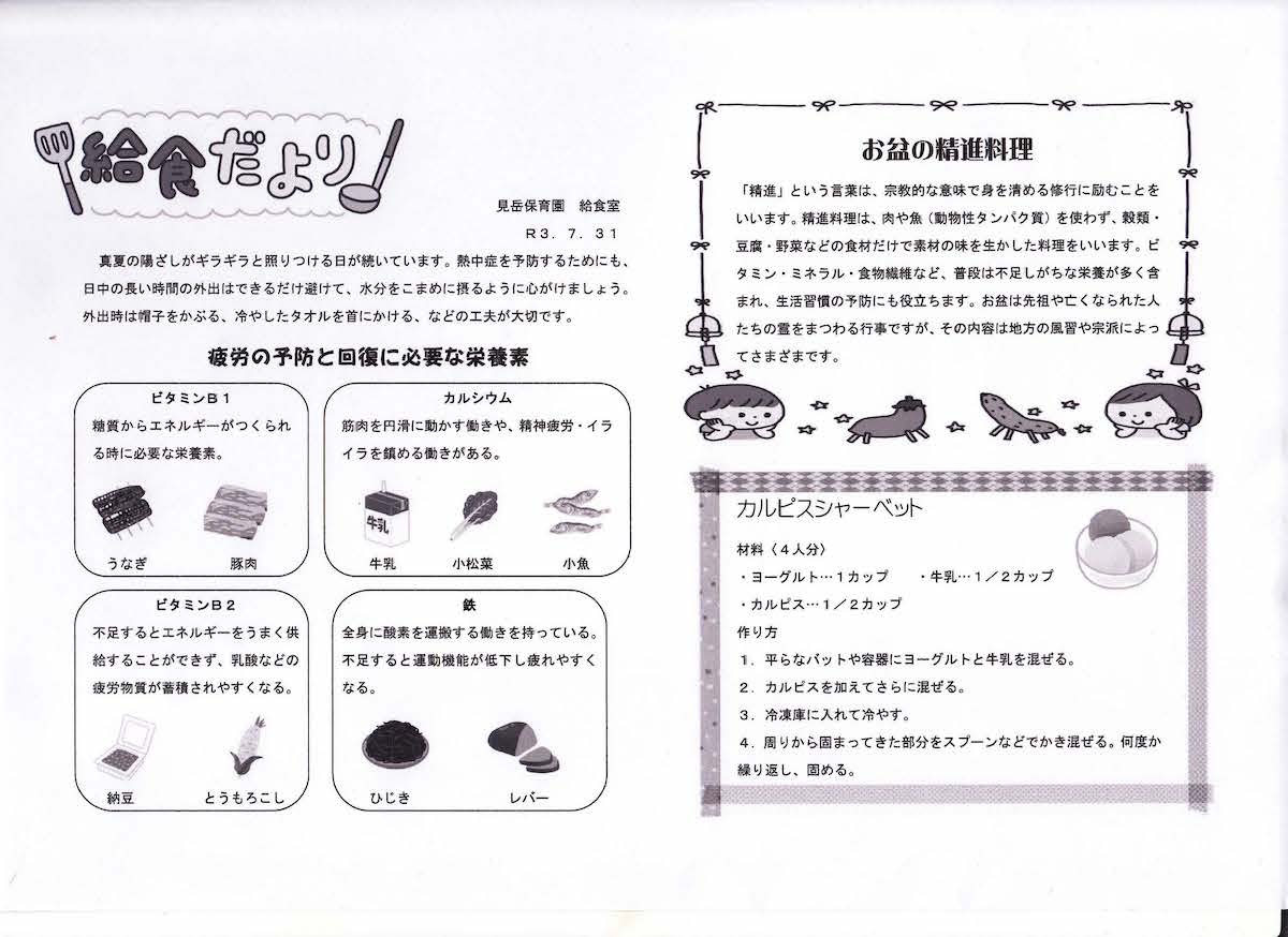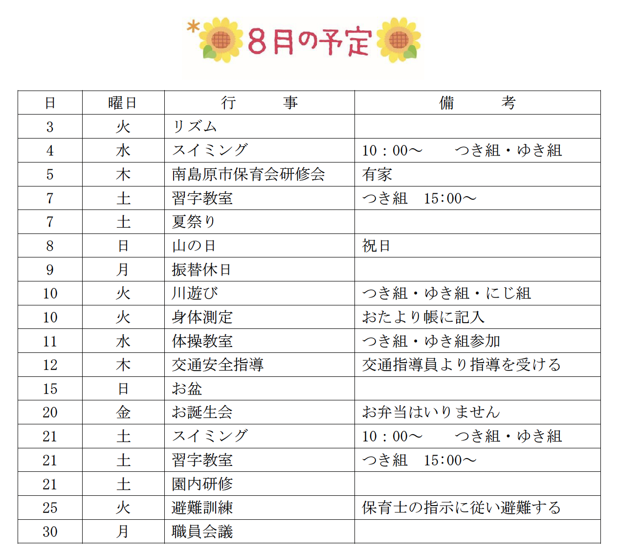 セミの声が朝からにぎやかに響いて、いよいよ夏本番です。子ども達は毎日プール遊びに夢中で、暑さなんてなんのそのと元気一杯です。でも暑さで食欲がなくなったり、疲れで体調を崩しやすくなる時期でもありますので、水分補給と十分な休息を心掛け、夏を元気に過ごせるようにしていきたいと思っています。