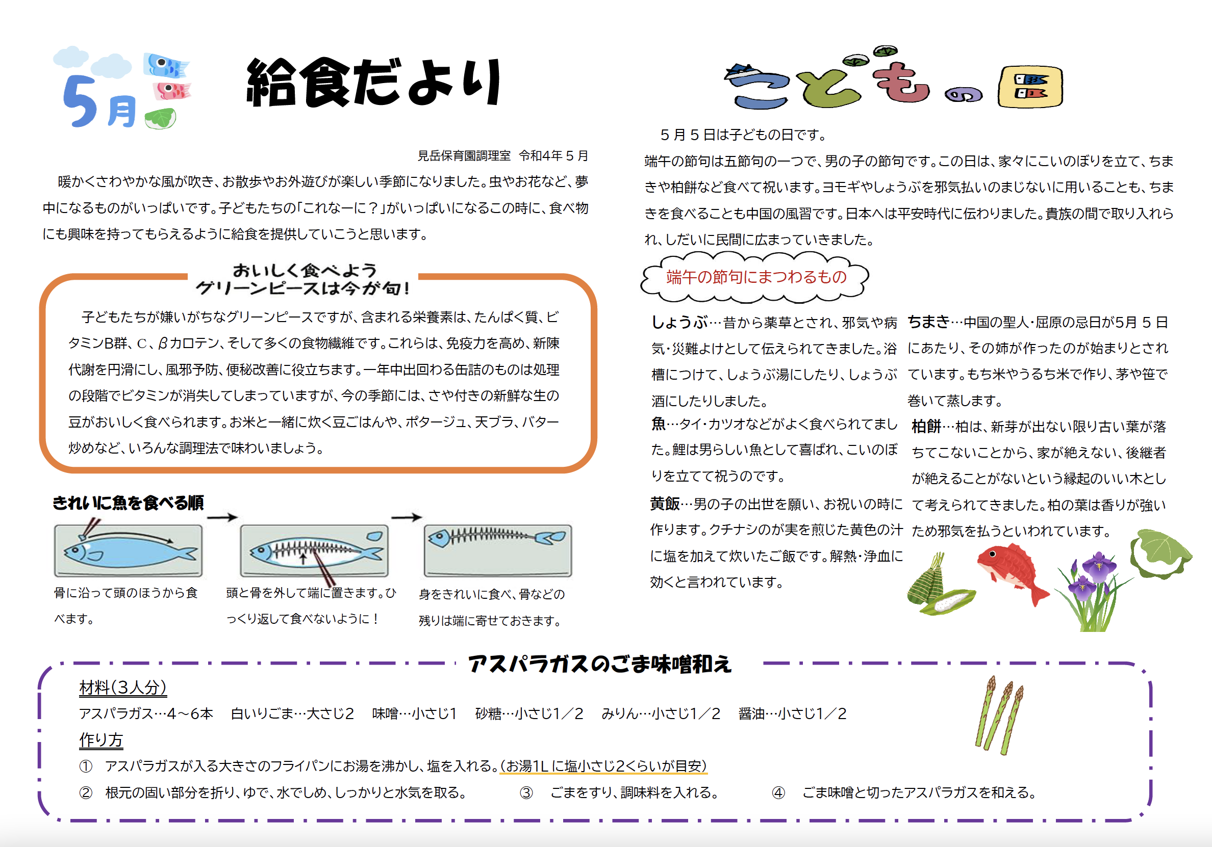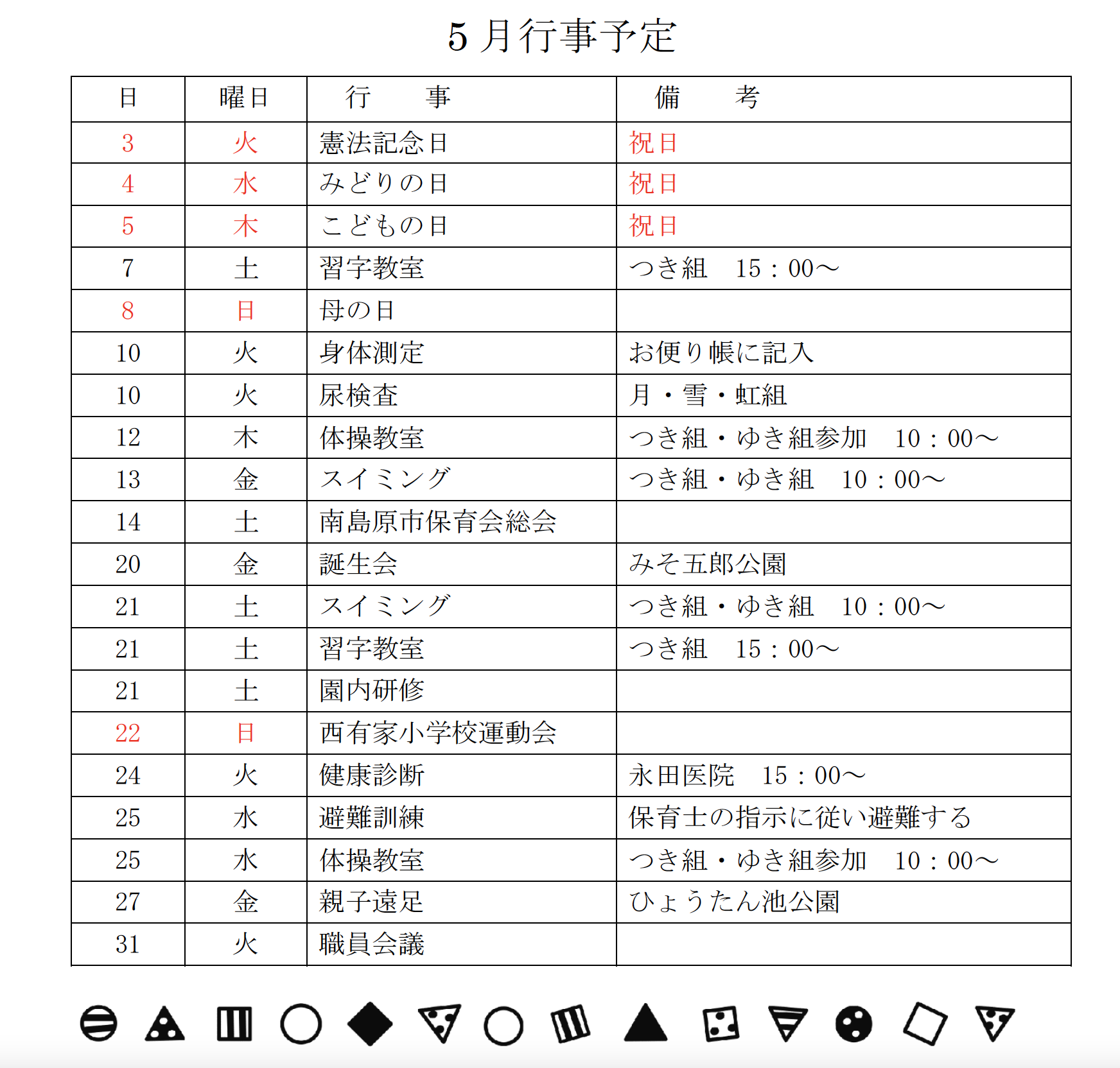 新録が鮮やかで、とても心地よい季節になりました。子ども達は入園・進級してから一ヶ月が過ぎ、園の生活にも慣れてきたようです。お兄さん、お姉さんになったお友達は、小さいお友達の面倒を見たりブランコ、滑り台、砂場とそれぞれ好きな遊びを見つけて遊んでいます。爽やかな季節、水分をこまめに取りながら、戸外で元気いっぱい遊べるようにしていきたいです。