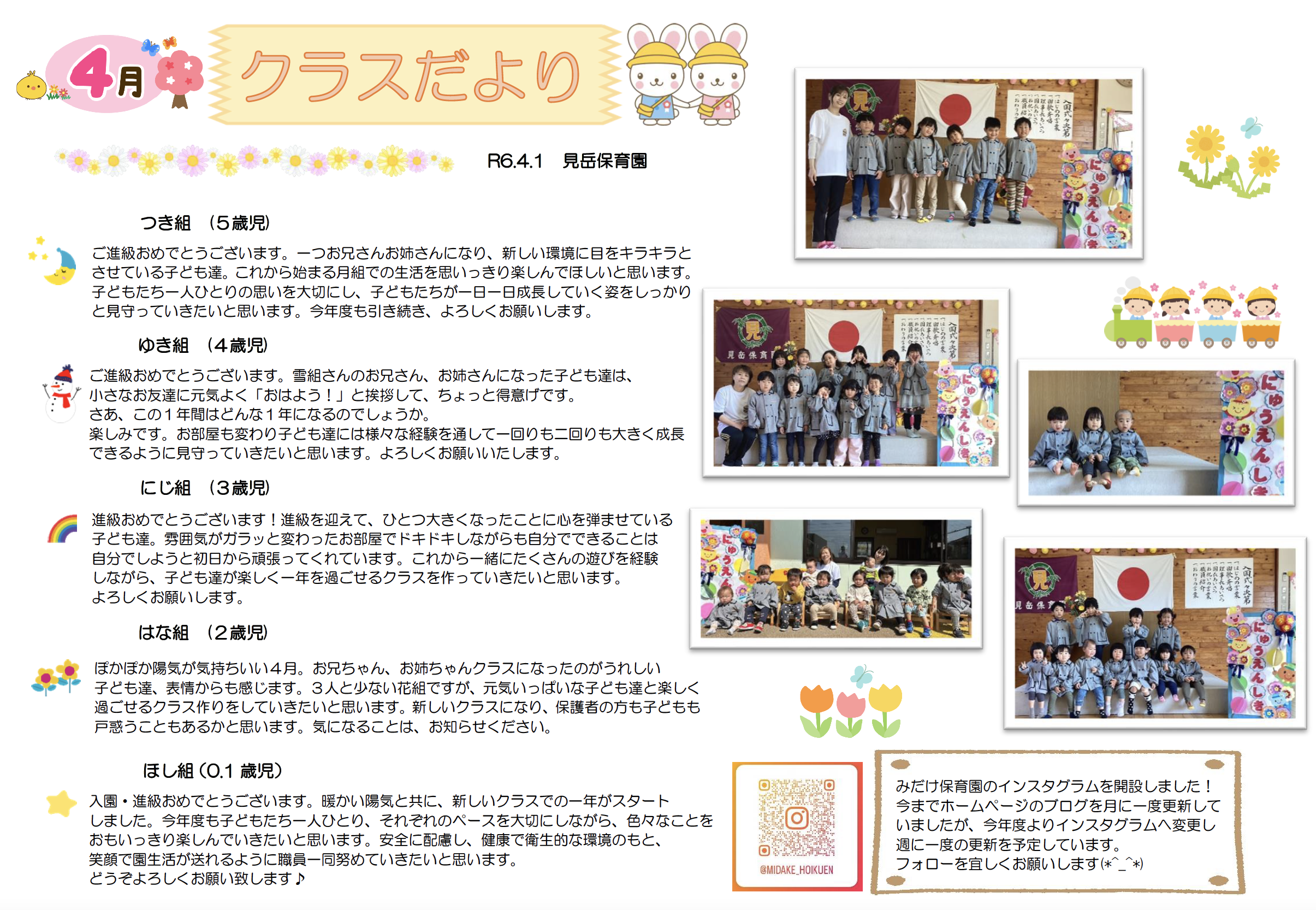 ご入園・ご進級おめでとうございます! 園庭の花々がきれいに咲き、皆さんの入園・進級をお祝いしているようです。 これから一年間、たくさんの可能性を秘めた子ども達の健やかな成長を願って、保護者の方が安心して預けられるような園であるように、職員一同心を込めて保育していきたいと 思います。今年度もどうぞよろしくお願い致します。