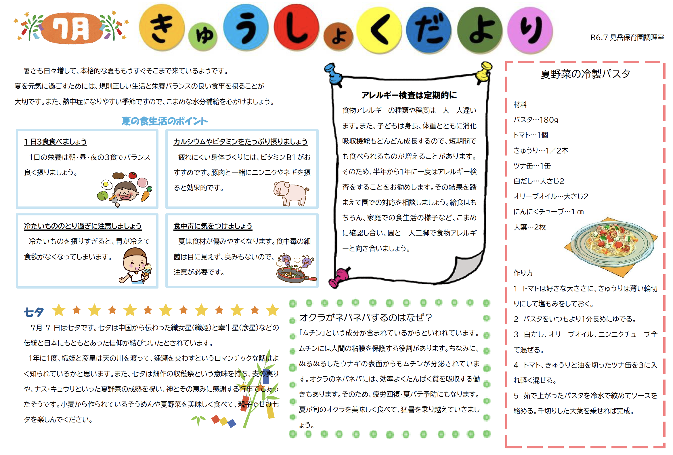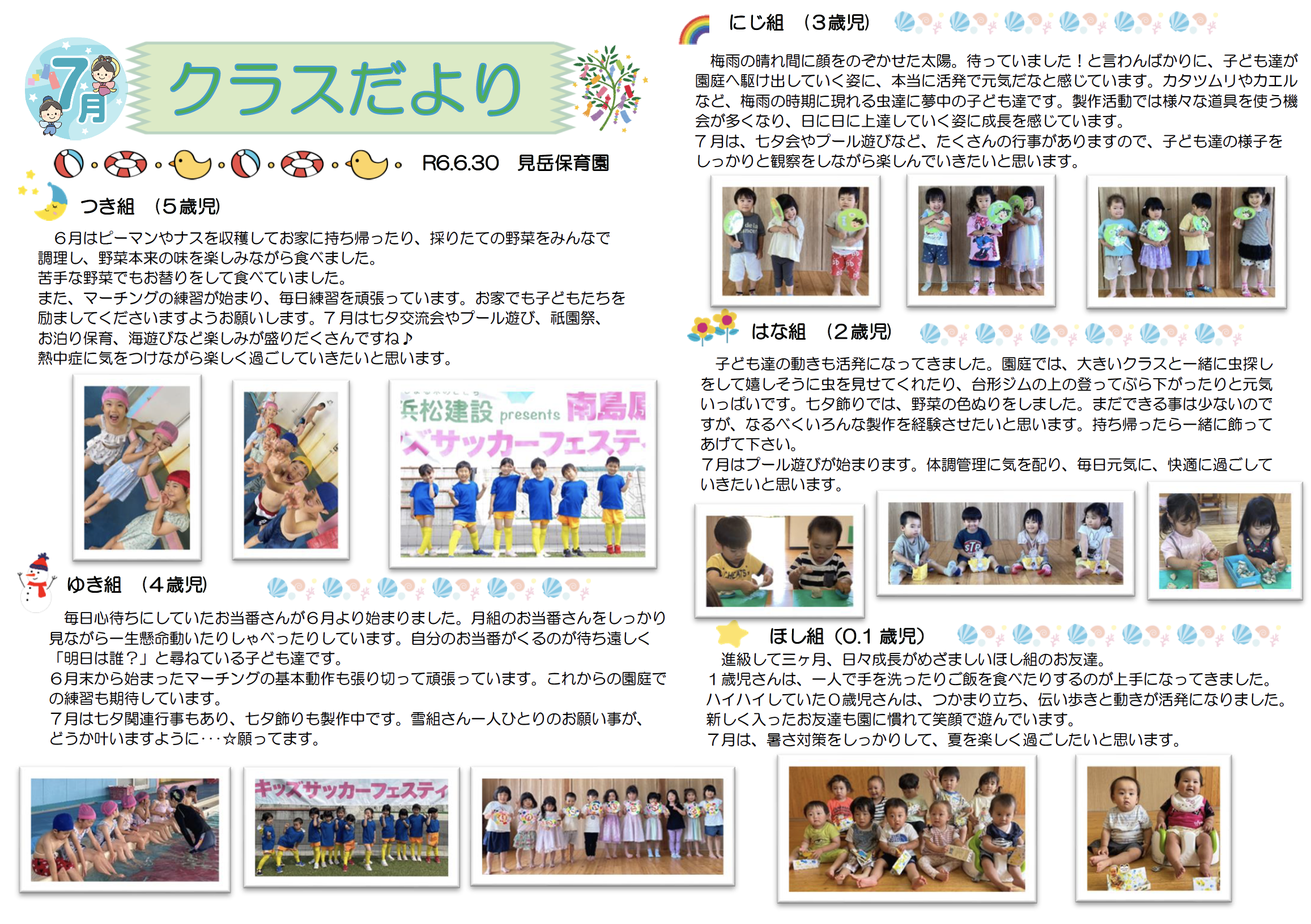 梅雨の晴れ間に園庭で元気に遊ぶ子ども達。思いきり体を動かすと心も体も晴れやかになりますね。子ども達は暑さを吹き飛ばす勢いで、カタツムリやダンゴムシを探したり、鬼ごっこをしたりと元気いっぱい外遊びを楽しんでいます。今月は子ども達が大好きな プール遊びが始まったり、七夕会など楽しい行事も盛りだくさんです。 こまめな健康観察と水分補給を心掛けながら、楽しく過ごしていきたいと思います。
