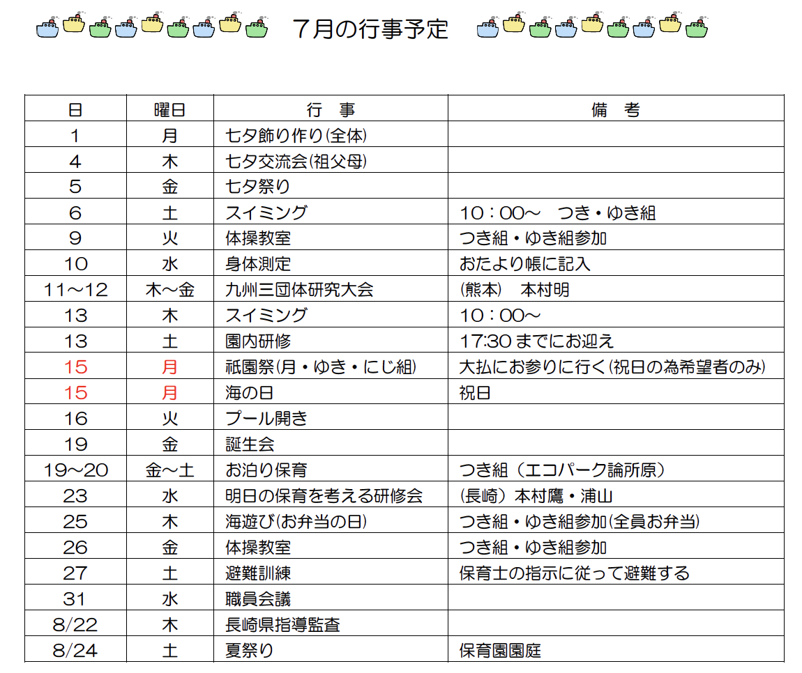 夏の自然に興味を持たせ、水遊びを 楽しませるとともに、一人一人の 体調管理に気を付け夏を元気に過ごす。