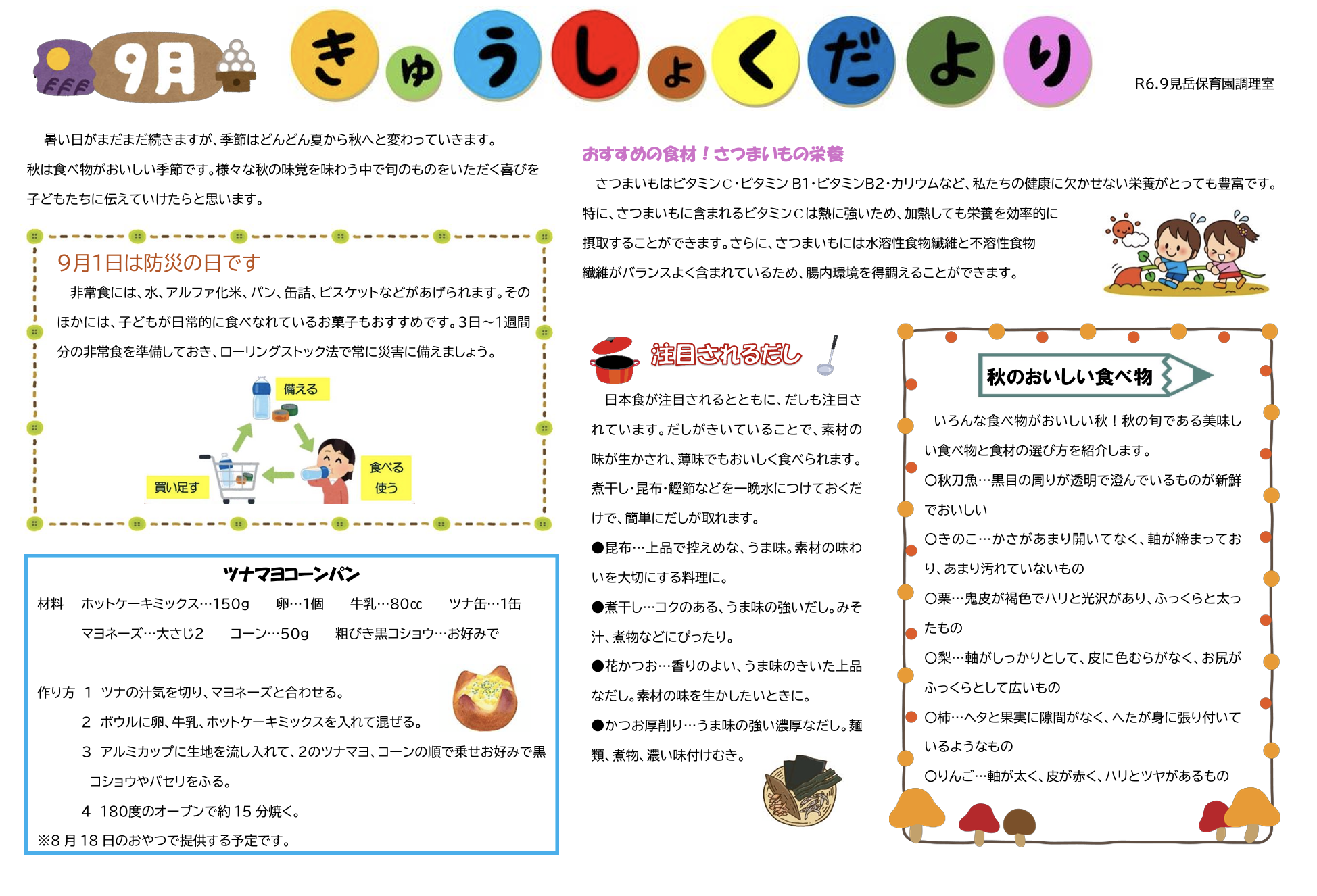 残暑の中にも秋の気配が感じられるようになってきました。 子ども達は、いい色に日焼けして少したくましくなったように思います。 そして、いよいよ9月!運動会は運動を通して心身共に成長する大事な行事です。友達とのつながりを深めながら、意欲的に活動できるように見守っていきたいと 思います。子ども達が毎日元気に登園できるよう、ご家庭と連絡を取り合いながら健康管理にも配慮していきたいと思います。