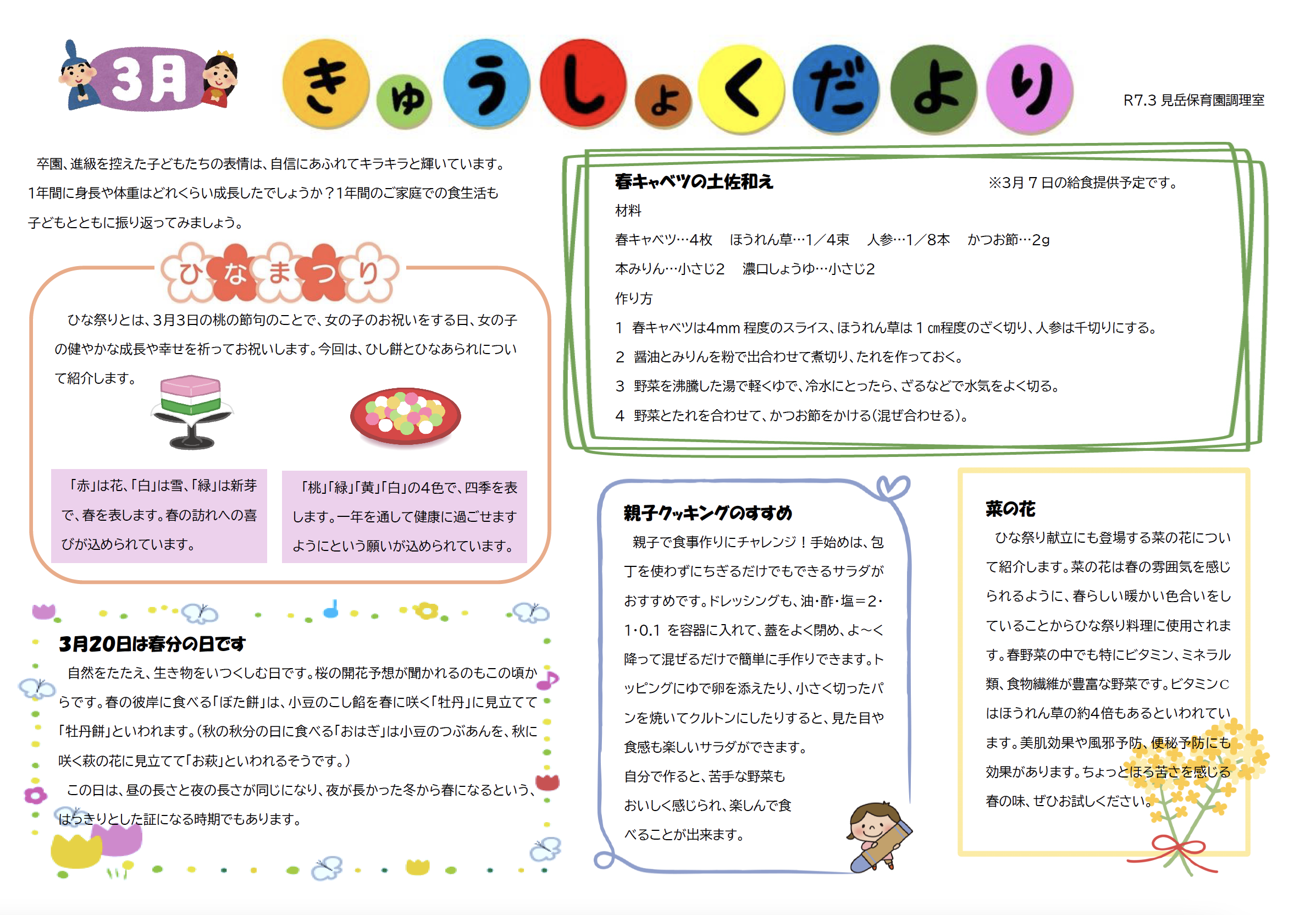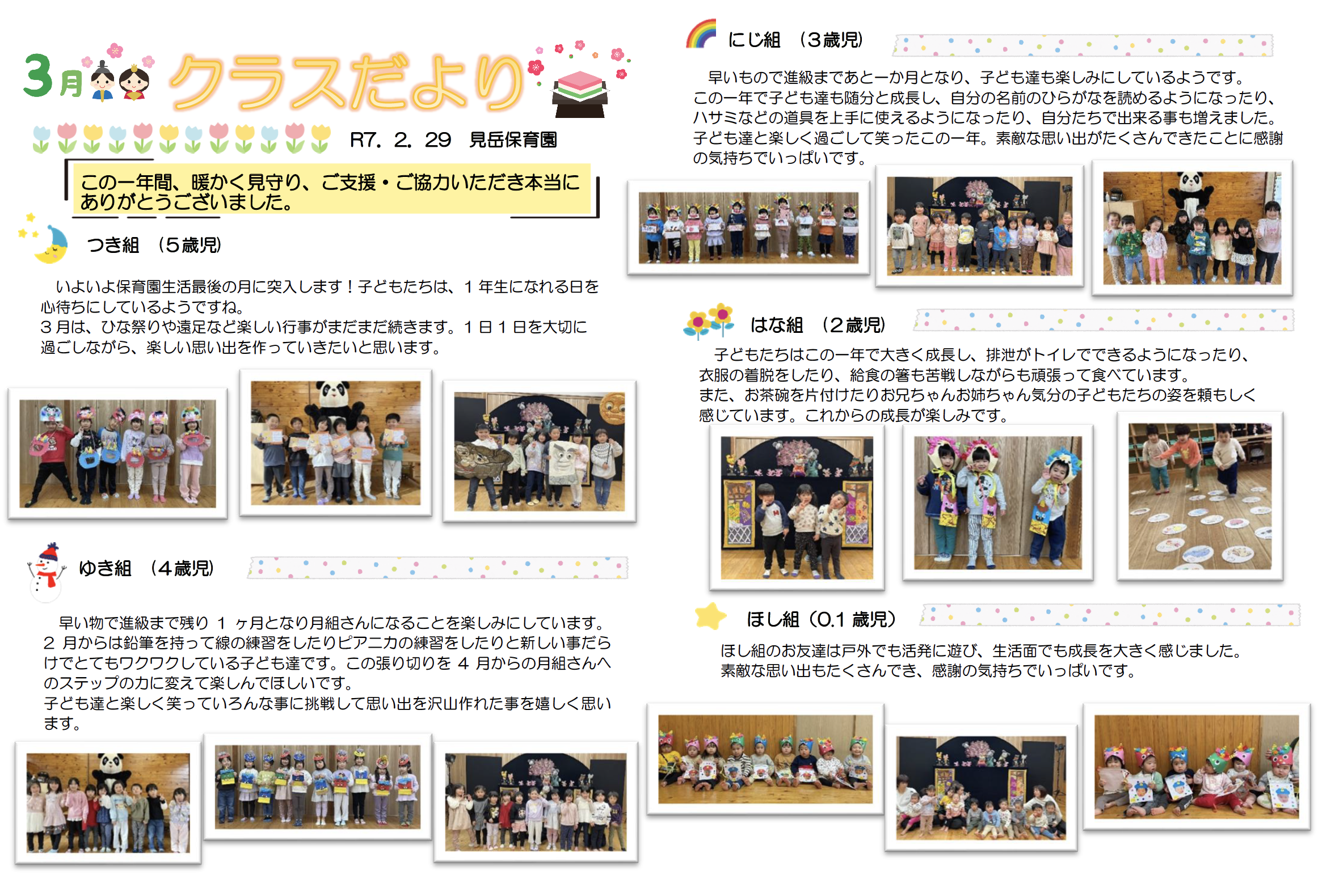いつの間にか日が長くなり、その穏やかな日差しの中に春の訪れを感じるように なりました。月日が経つのは早いもので、いよいよ本年度の締めくくりの月となります。いろんな行事や活動を経験する中で、子ども達はひとまわりもふたまわりも大きくなりたくさんの思い出ができるよう、有意義に過ごしてほしいと思っています。 保護者の皆様にはこの一年間ご支援、ご協力をいただき誠にありがとうございました。