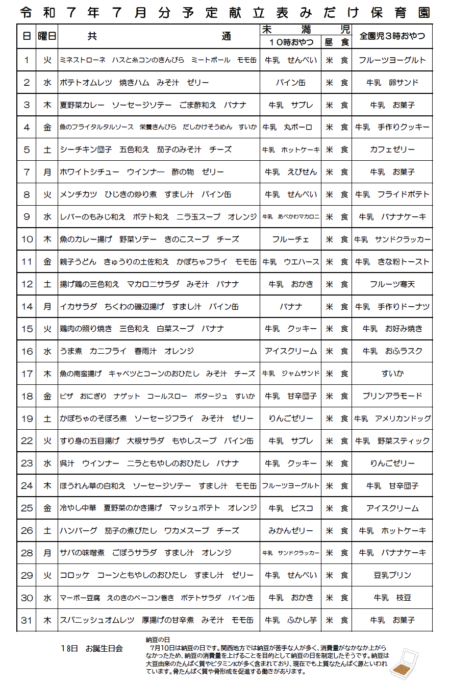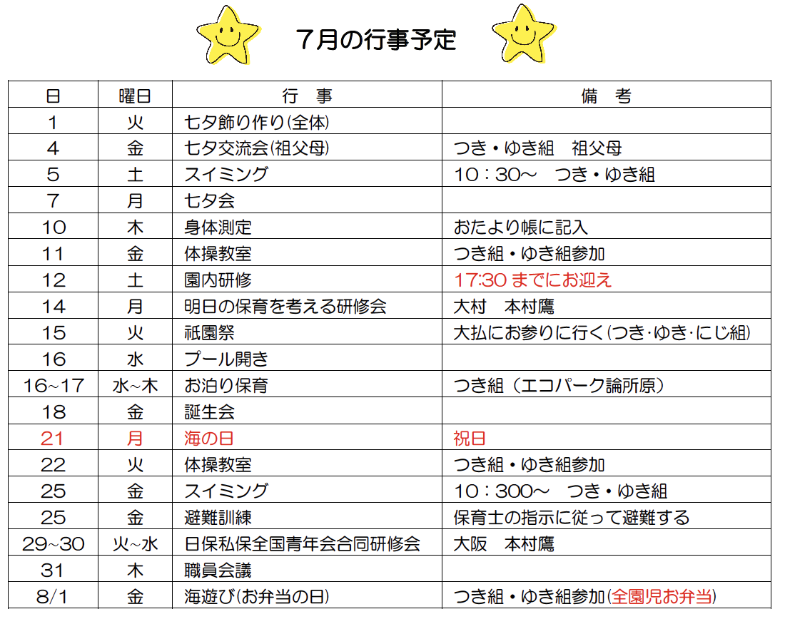 夏の自然に興味を持たせ、水遊びを 楽しませるとともに、一人一人の 体調管理に気を付け夏を元気に過ごす。