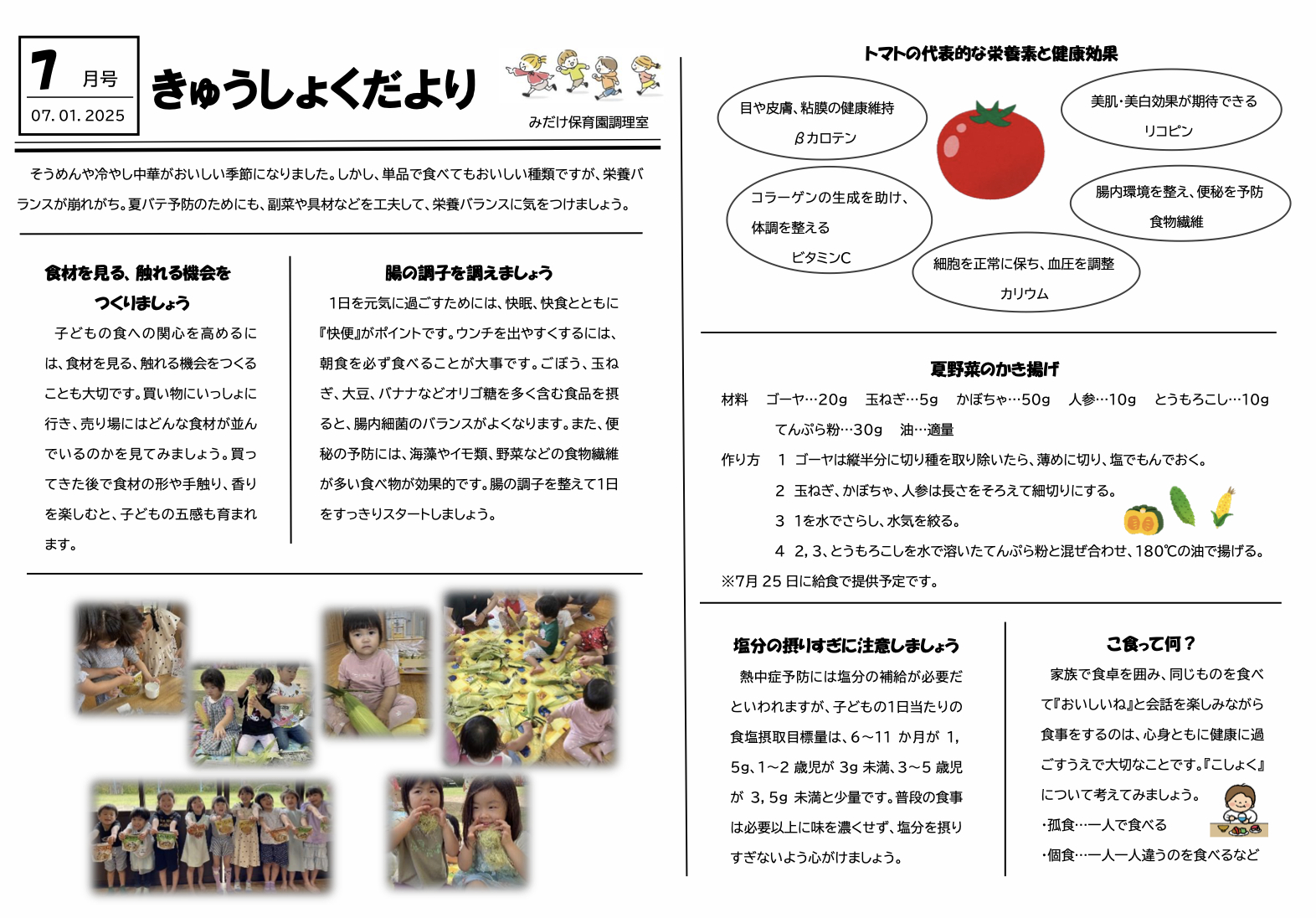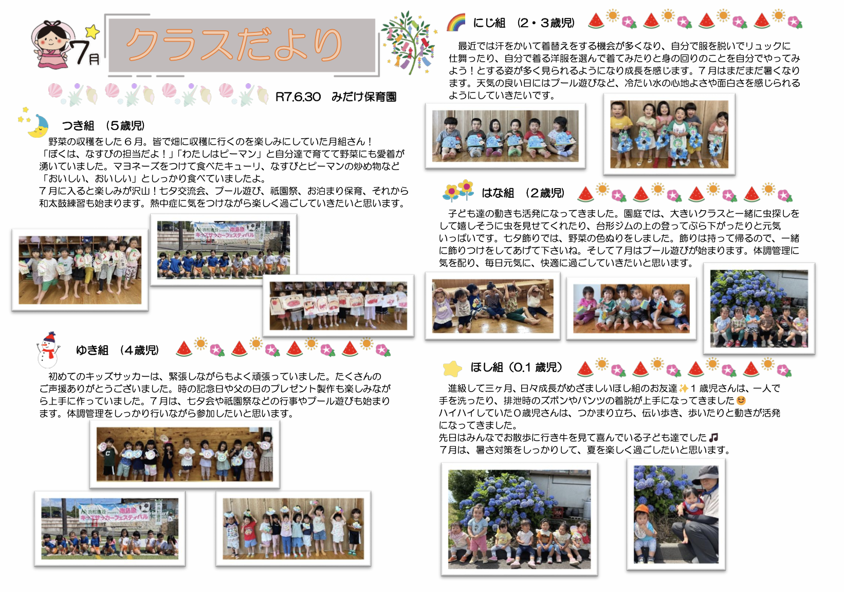 梅雨の晴れ間に園庭で元気に遊ぶ子ども達。思いきり体を動かすと心も体も晴れやかになりますね。子ども達は暑さを吹き飛ばす勢いで、カタツムリやダンゴムシを探したり、鬼ごっこをしたりと元気いっぱい外遊びを楽しんでいます。今月は子ども達が大好きな プール遊びが始まったり、七夕会など楽しい行事も盛りだくさんです。 こまめな健康観察と水分補給を心掛けながら、楽しく過ごしていきたいと思います。
