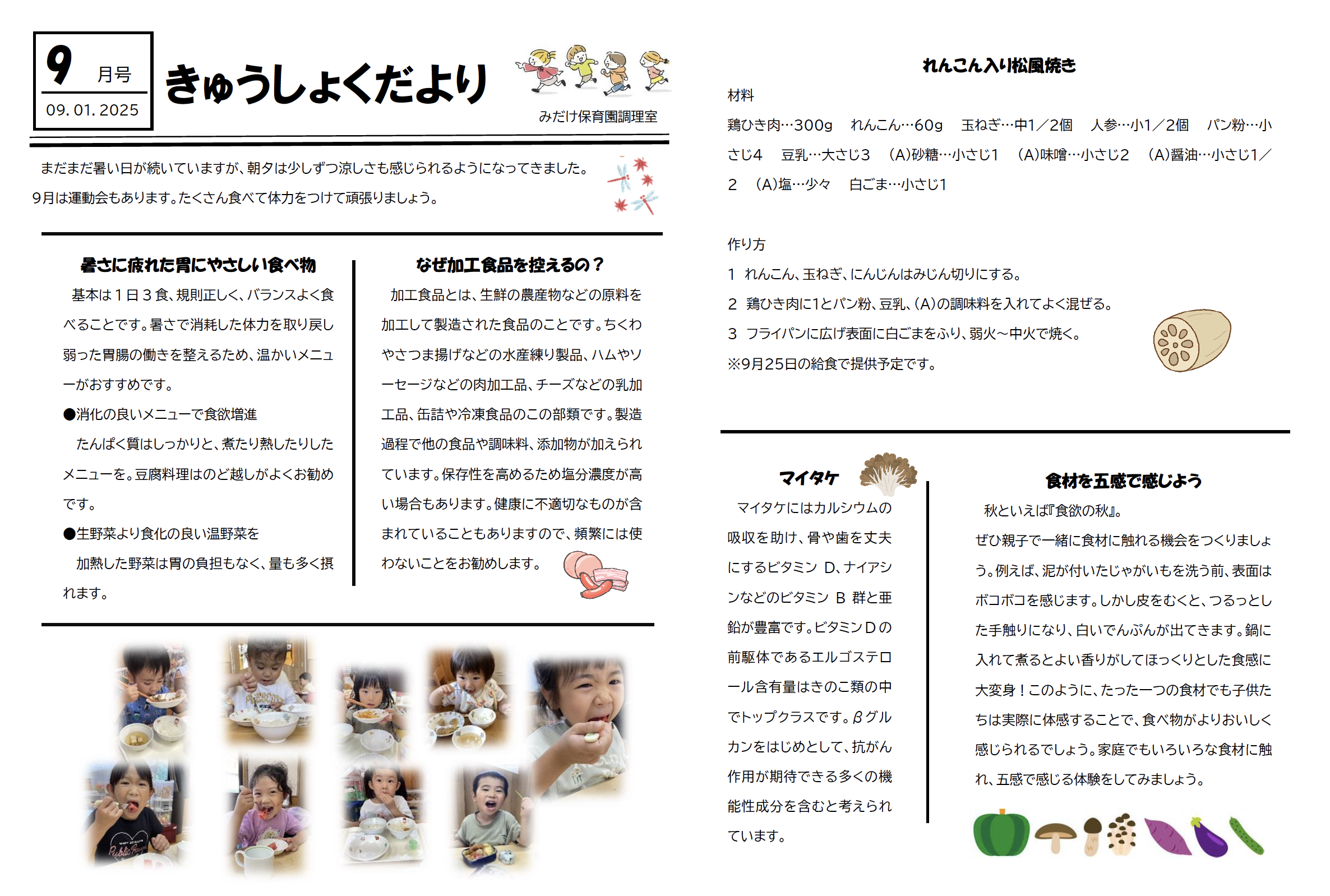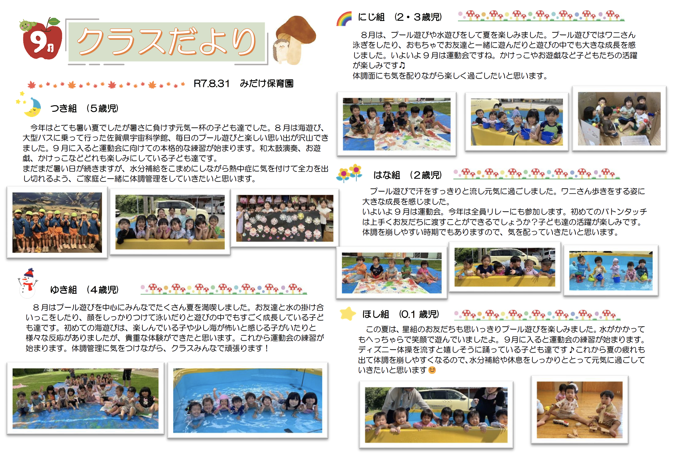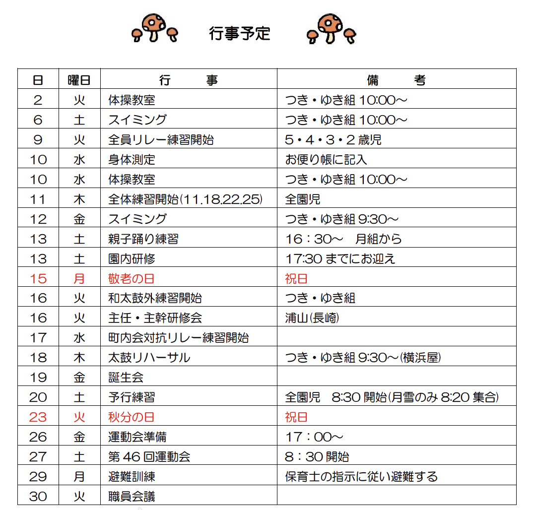 残暑の中にも秋の気配が感じられるようになってきました。 子ども達は、いい色に日焼けして少したくましくなったように思います。 そして、いよいよ9月!運動会は運動を通して心身共に成長する大事な行事です。友達とのつながりを深めながら、意欲的に活動できるように見守っていきたいと 思います。子ども達が毎日元気に登園できるよう、ご家庭と連絡を取り合いながら健康管理にも配慮していきたいと思います。