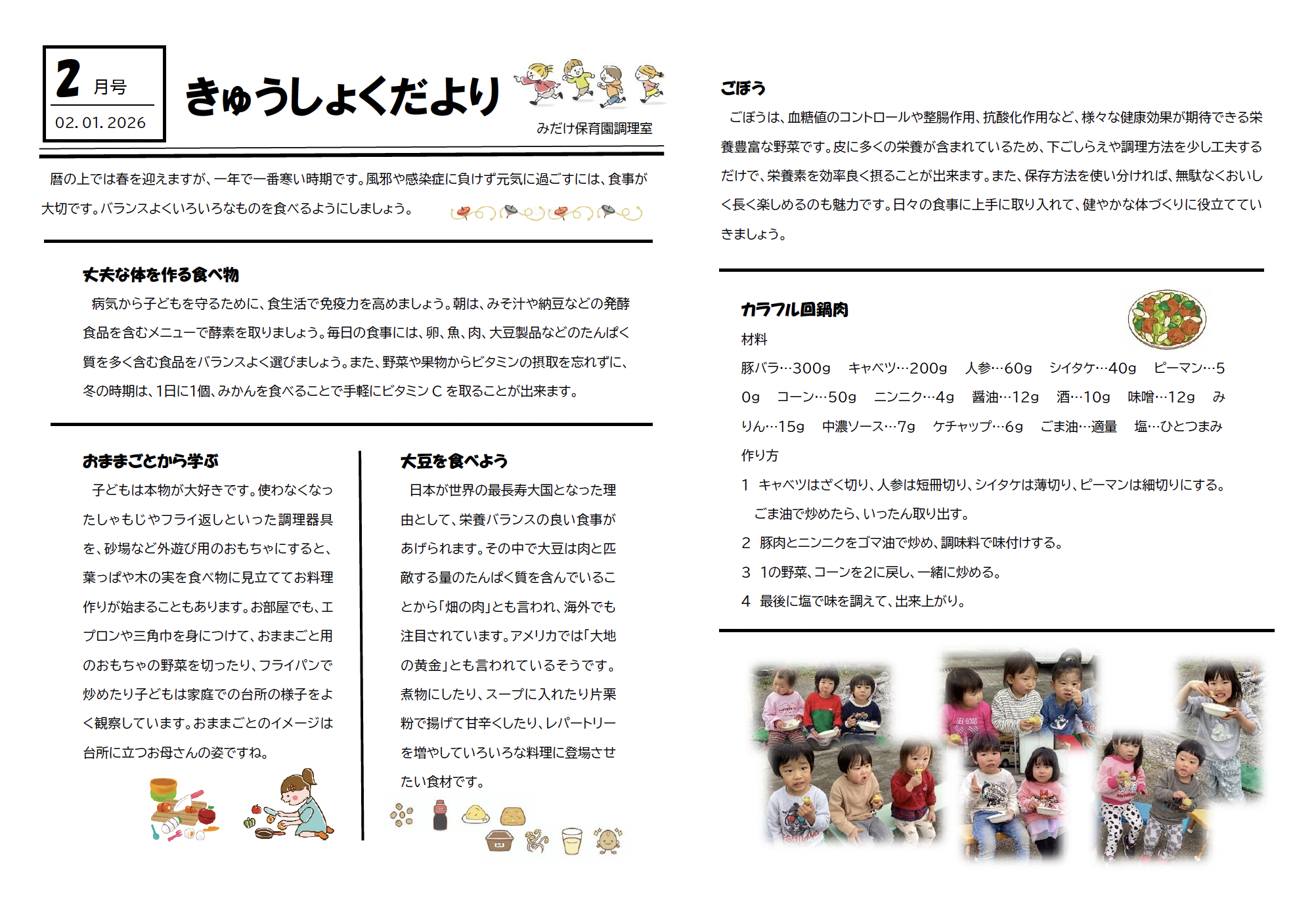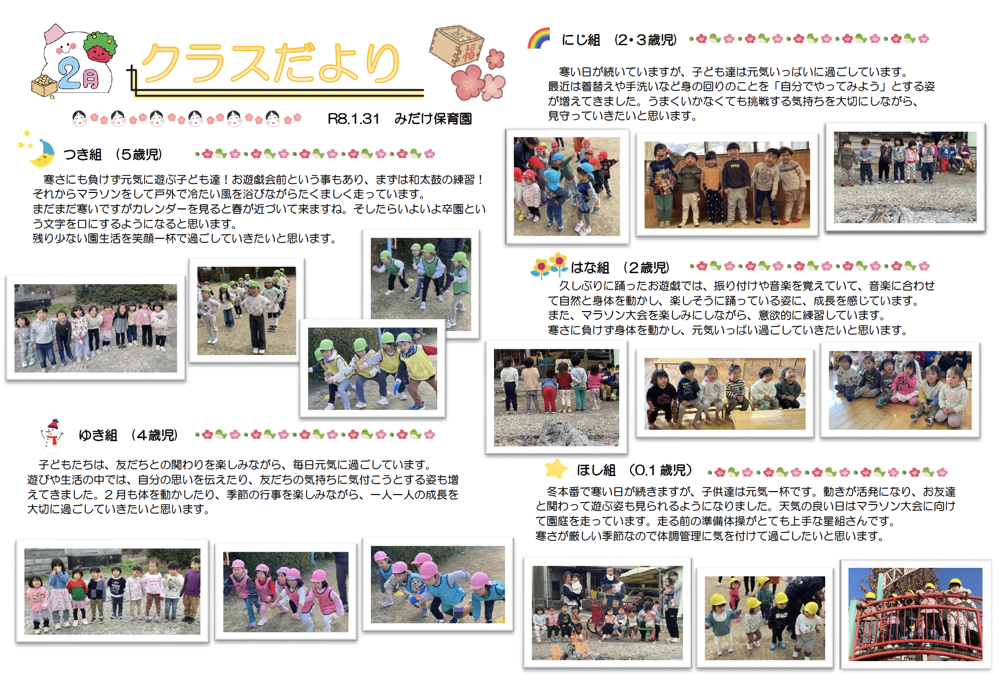 マラソンや戸外遊びで丈夫な体を作り、手洗い・消毒を丁寧に行い予防を心がけて いきたいと思います。